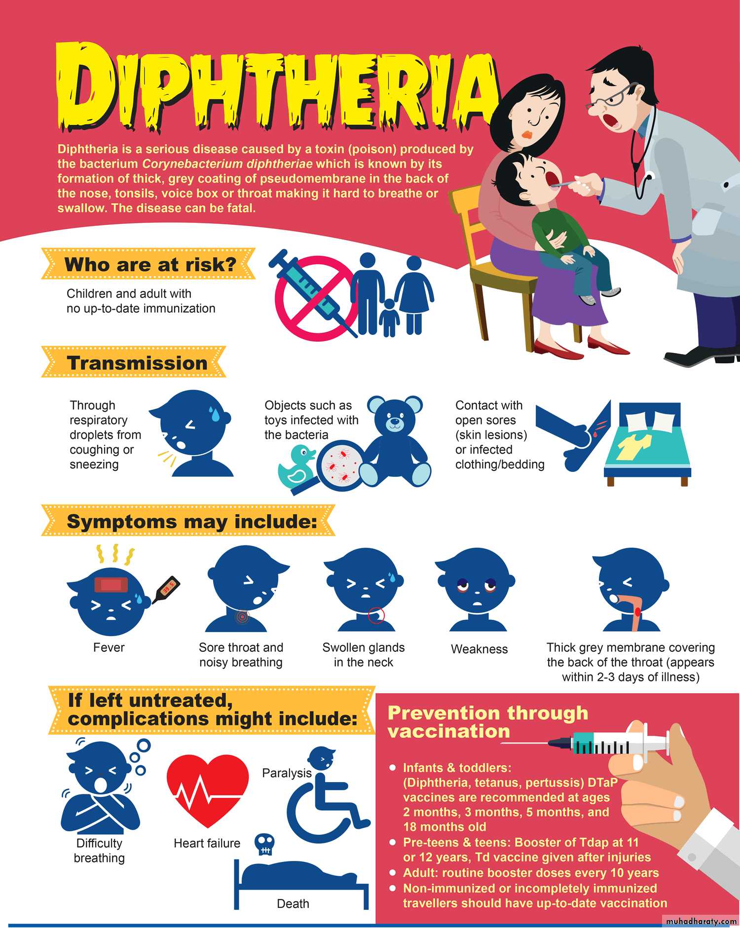 Prophylaxis (Vaccination):Active immunization is done by diphtheria toxoid that induces antitoxin production in the body.