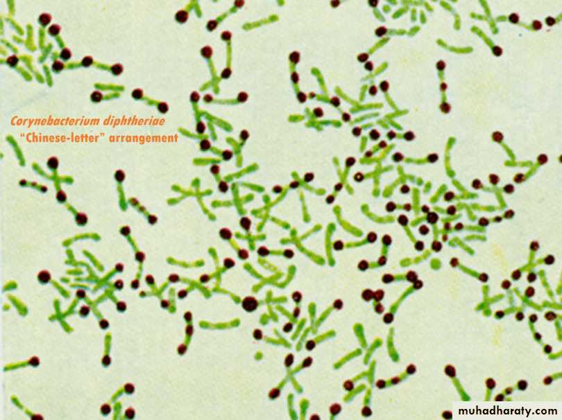 Corynebacterium are club-shaped gram-positive, non-capsulated, non-spore forming, non-motile rods.Chinese letter or cuneiform arrangement in smear (V or L shaped).
