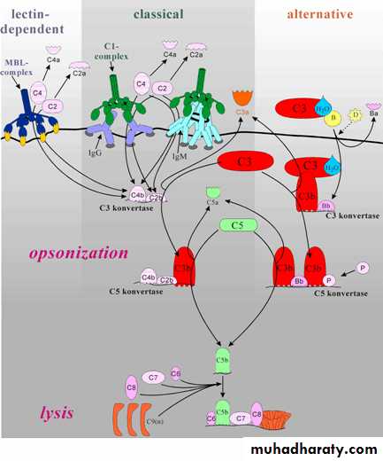 3.After accumulations of C3b molecules, C3b•Bb•C3b is formed which is a C5 convertase acting on C5 and can start the assembly of the membrane attack complex as in the classical pathway.