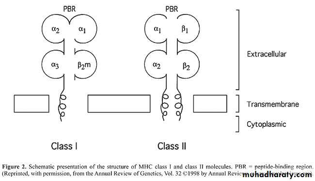MHC class I molecules are heterodimers consisting of a single transmembrane glycopeptide heavy chain (mol. wt. 43kDa), it comprises three extracellular domains α1,α2 & α3.It is associated non covalently with a light non- MHC- encoded polypeptide chain called β2- microglobulin ( mol. wt. 12 kDa).