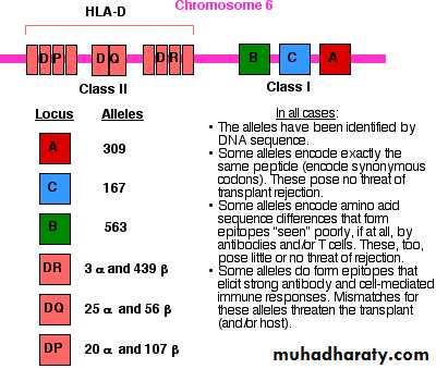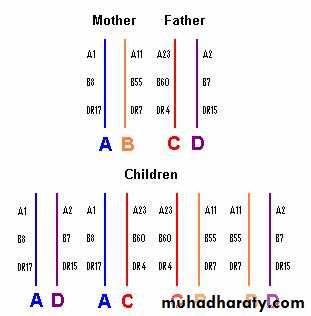 Each set of alleles is referred to as a haplotype. An individual inherits one haplotype from the mother & one from the father.The genes of both haplotypes are codominantly expressed. There are many alternative forms of genes or alleles at each locus. There are about 300 alleles for A, 500 for B, 150 for C & 500 for (DP, DQ &DR).