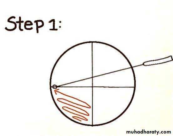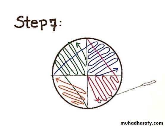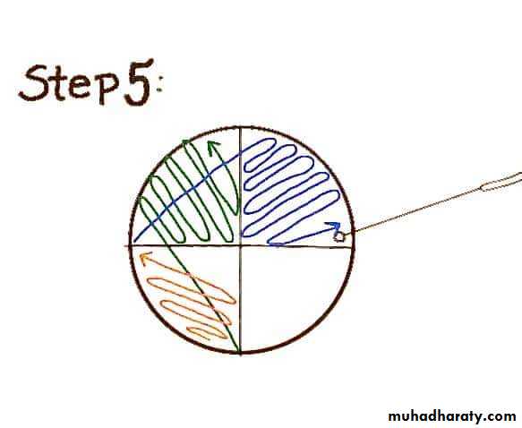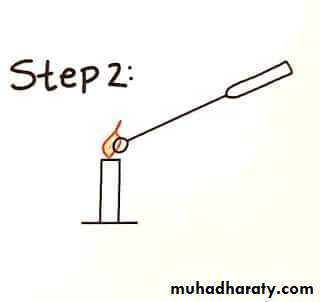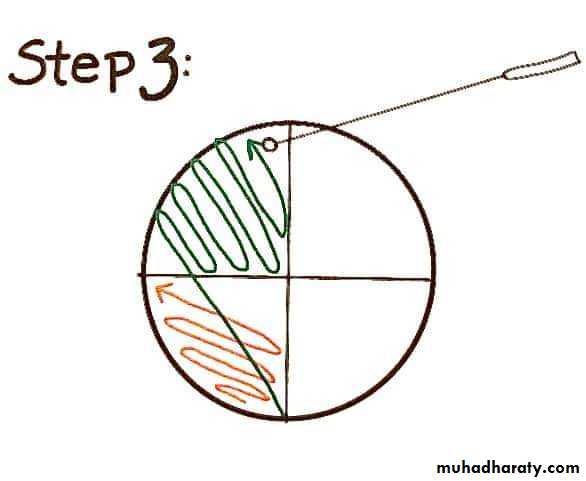 Sterilize the loop in a Bunsen flame, cool it and streak the specimen over an area – A.Re – sterilize the loop, cool it, then streak over an area – B from the distal part of area – A.