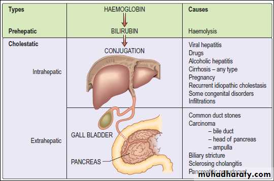This is caused either by haemolysis or by congenital hyperbilirubinaemia, and is characterised by an isolated raised bilirubin level.Hepatocellular jaundice