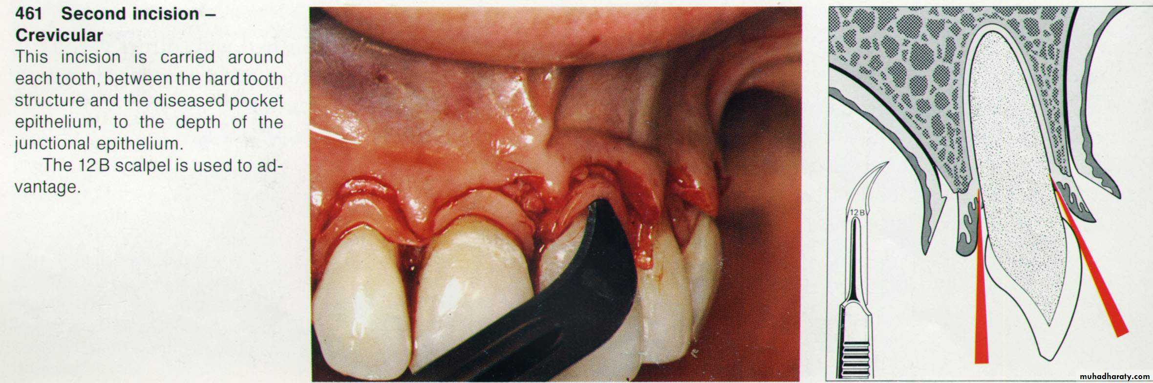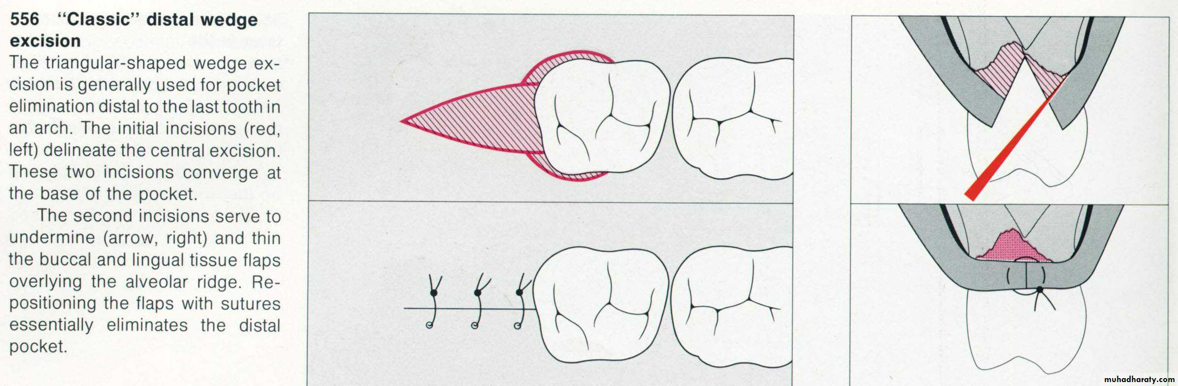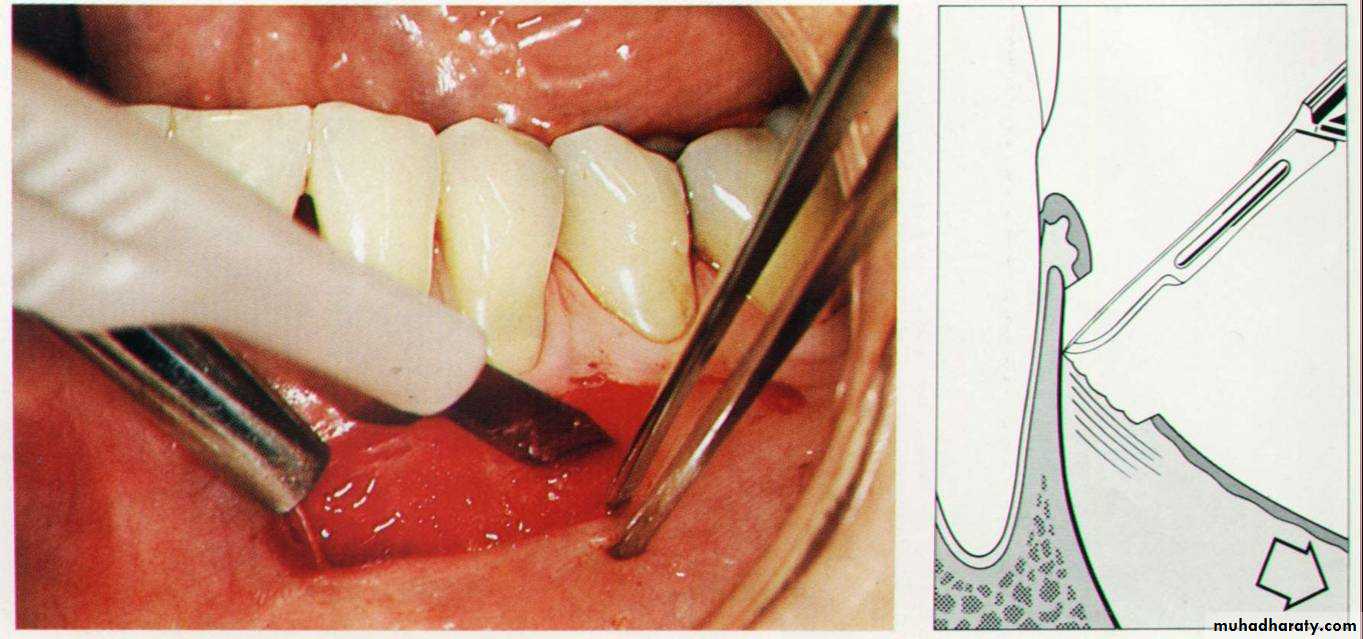 (Distal wedge)This can be used distally to last molars or molars near to an edentulous area to gain access for root planning and pocket reduction. Initial incision is done buccally and palatally (distal wedge). Tissues between the two incisions are removed & the flap is reflected as much as possible fore better visualization of the root surface. The flap is then sutured after removing the excised tissue & packed with periodontal dressing.