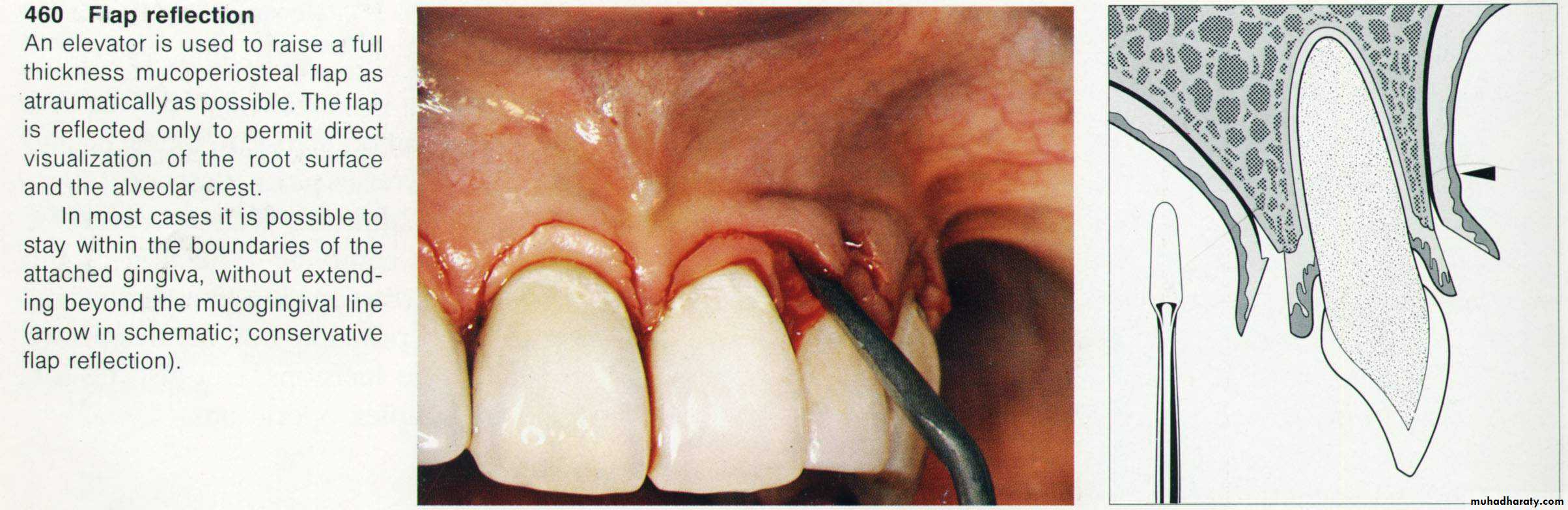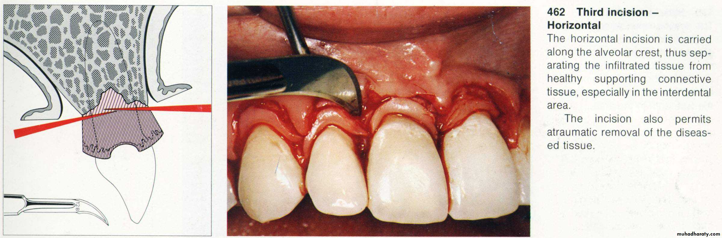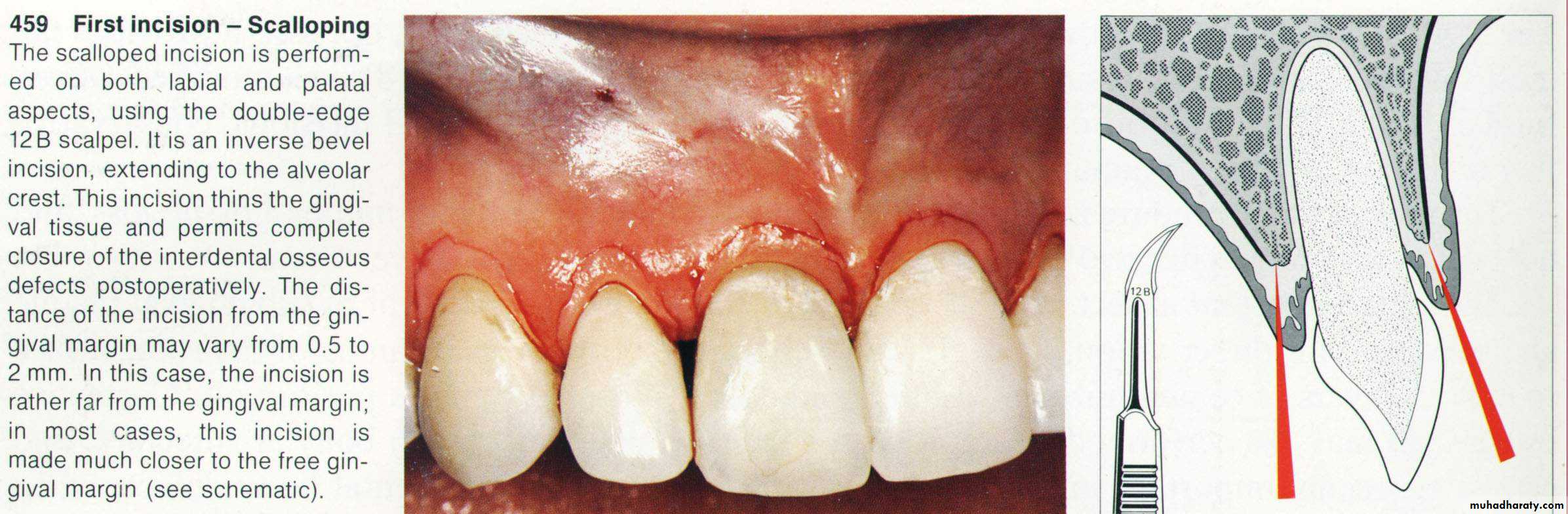 (Distal wedge)This can be used distally to last molars or molars near to an edentulous area to gain access for root planning and pocket reduction. Initial incision is done buccally and palatally (distal wedge). Tissues between the two incisions are removed & the flap is reflected as much as possible fore better visualization of the root surface. The flap is then sutured after removing the excised tissue & packed with periodontal dressing.