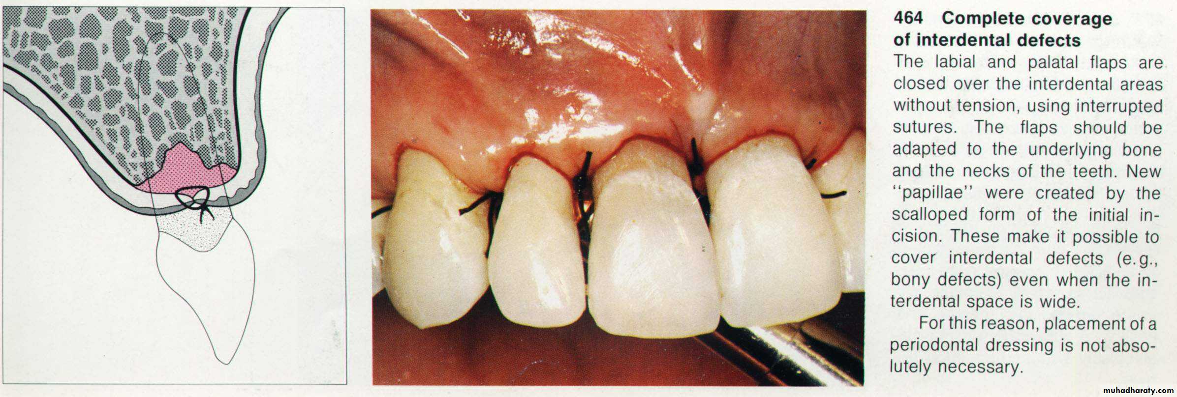 They may be either interrupted inter dental suture which used to approximate buccal & lingual flaps in replaced flaps , or Suspensory suture which used in surgical procedures involving one aspect only & also in repositioned flaps, or continuous suturing which used when several teeth are involved.Periodontal dressing: