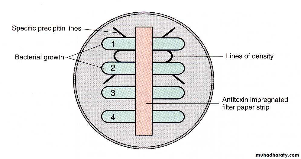 A filter strip containing anti-toxin antibody is placed perpendicular to the streak of the organism.