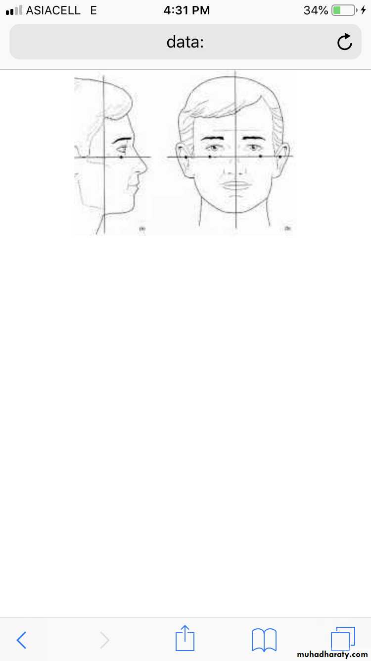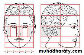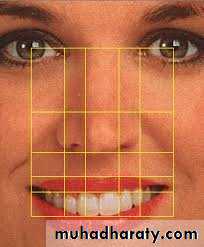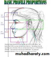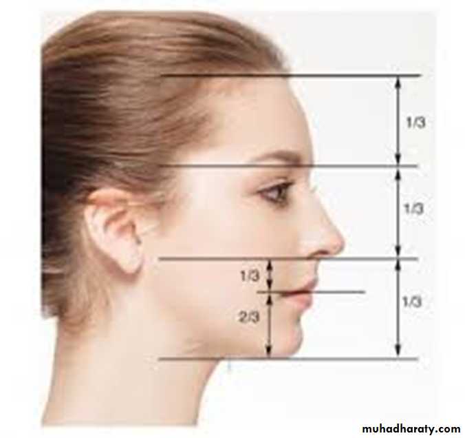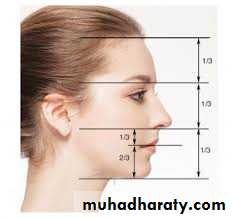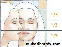 • Facial proportions: The facial height is divided in three main thirds.The :• upper facial third goes from the hairline to the glabella. the middlethird from the glabella to the base of the columella, and the lower thirdfrom the columella to the deepest point of the chin prominence.The lower third is subdivided in to one upper third from the columella base to the lip commissure and two lower thirds from the lower lip to thechin .