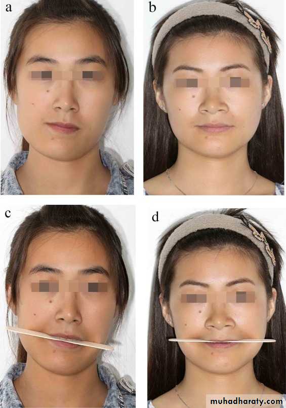 Facial symmetry : the symmetry of the facial midline structures such as the forehead (glabella), nasal tip, upper lip maxillary dental midline, mandibular dental midline, lower lip, and chin should be assessed. The clinician should consider whether orthodontic or surgical Correct of the dental midlines should be planned.
