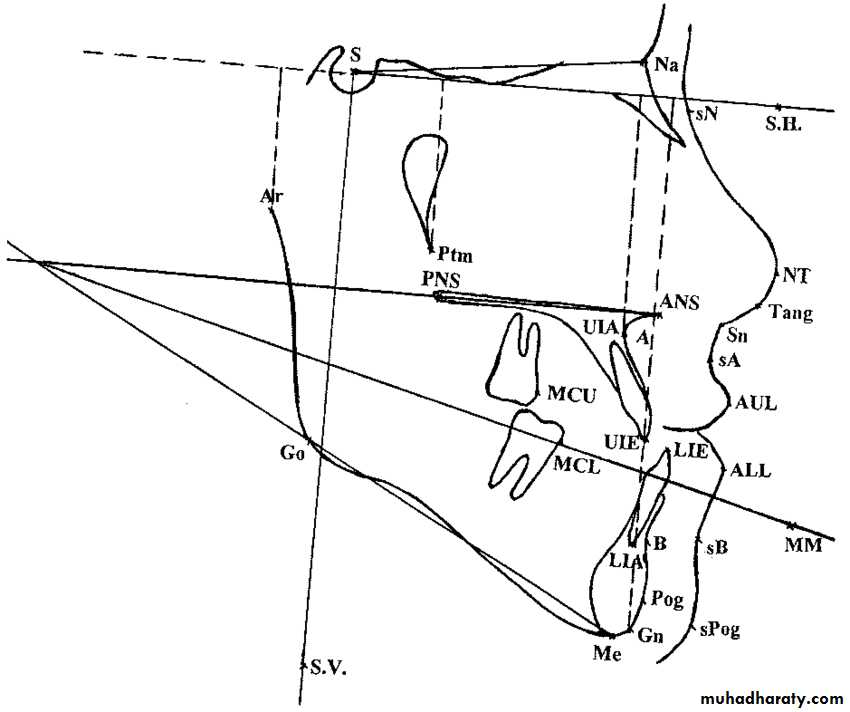 Cephalometric is done to evaluate the proportions of the facial skeleton and to compare an individual patient with norm. Standard skeletal analysis is based on plain X-Rays taken in the sagital and frontal plane. Typically the X-rays are analyzed with the help of computer based programs. Protocols for analysis differ to some extent. All of them are based on reference points, lines, and angles which are marked on the X-ray.Hard tissue landmarks are as follows: