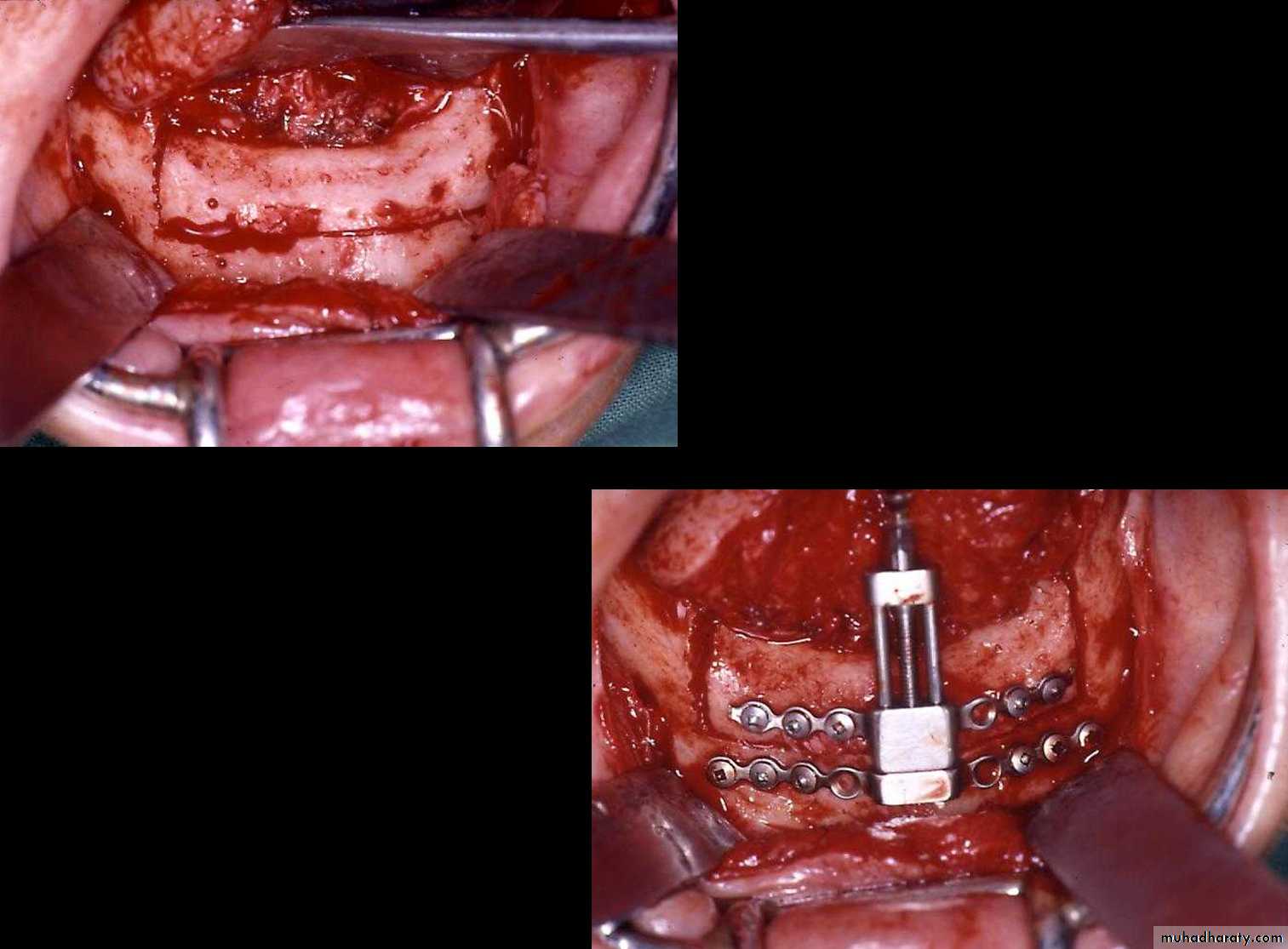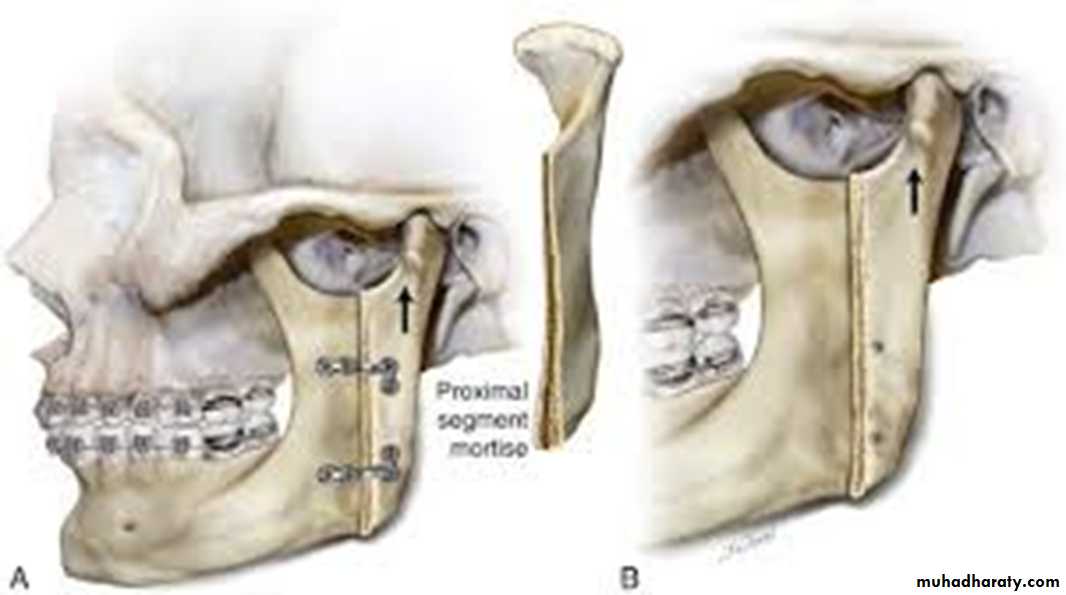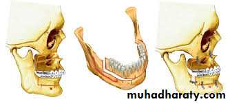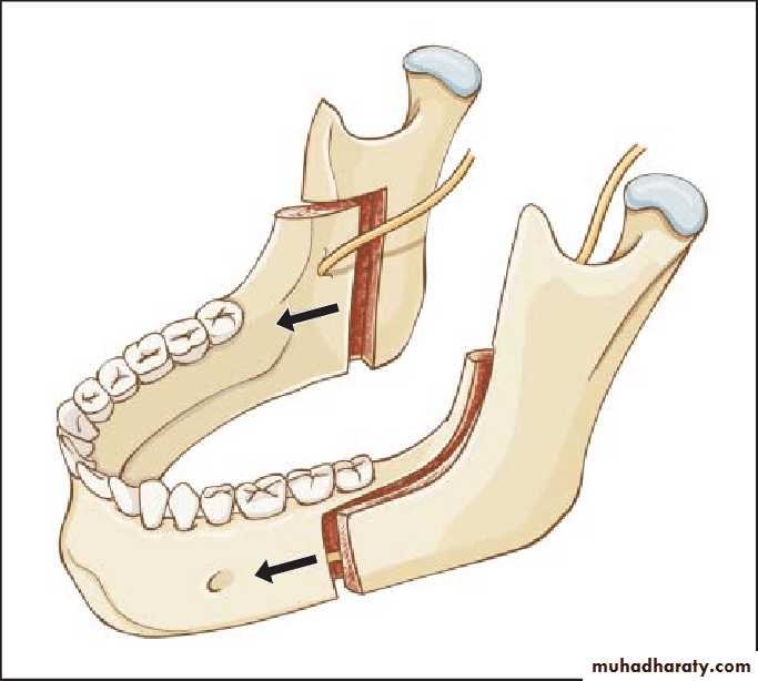 A similar technique is performed with an intraoral incision and an angulated oscillating saw.. The bone segments can be stabilized using IMF, with or without direct wiring of the segments or using rigid fixation with bone plates or screws, eliminating the need for IMF. The advantages of the intraoral technique include elimination of the need for skin incision and decreased risk of damage to the mandibular branch of the facial nerve.