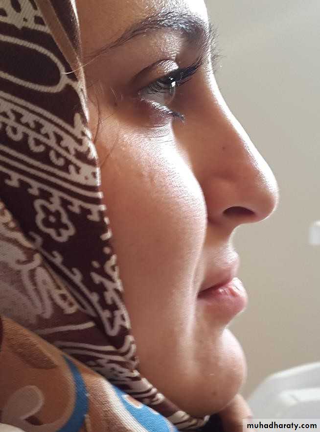Nasolabial angle: is measured between the columella of the nose and the upper lip. The angle should be 90 +_10° and is a guide to the upper lip support by the maxillary incisors. It is, however, also influenced by the decreased vertical dimension due to maxillary vertical deficiency.The lip-chin-throat angle: is formed between the lower border of the chin and a line connecting the lower lip and soft tissue pogonion (110±10º). It is most commonly acute in flat or concave profiles with class III dento-skeletal patterns. An obtuse angle is seen in class II malocclusion, mandibular antero-posterior deficiency, and is often exacerbated by microgenia.