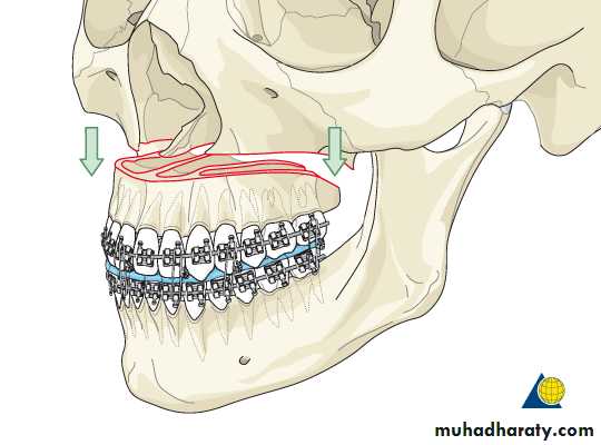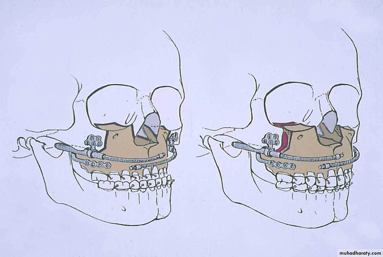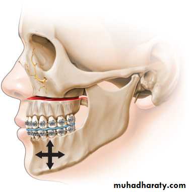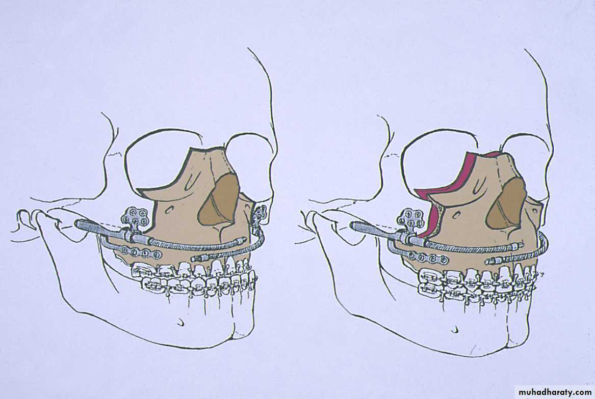 results in a convex facial profile usually associated with incisor protrusion and a Class II occlusal relationship. Total maxillary surgery ( lefort I ) can be completed to correct this problem In some cases the entire maxilla can be moved in one piece in a posterior direction. In addition to procedures in which the maxilla is moved in one piece, the bone can be sectioned into dento-alveolar segments to allow repositioning 1n anteroposterior, superior, or inferior directions or to allow expanding in the transverse directionMaxillary and Midface Deficiency