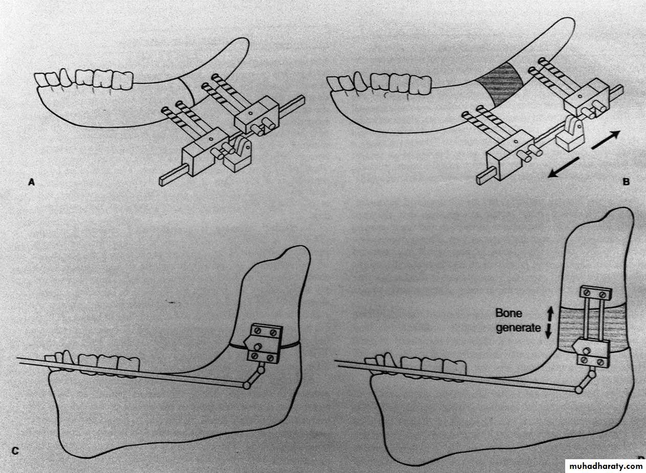 DISTRACTION OSTEOGENESISOne new approach for correction of deficiencies in the mandible and the maxilla involves the use of distraction osteogenesis (DO). When correcting deformities associated with these deficiencies, the conventional osteotomy techniques have several potential limitations. When large skeletal movements are required, the associated soft tissue often cannot adapt to the acute changes and stretching that result from the surgical repositioning of bony segments. This failure of tissue adaptation results in several problems, including surgical relapse, potential excessive loading of the TMJ structures, and increased severity of neurosensory loss as a result of stretching of nerves. In some cases the amount of movement is so large that the gaps created require bone grafts harvested from secondary surgical sites such as the iliac crest.