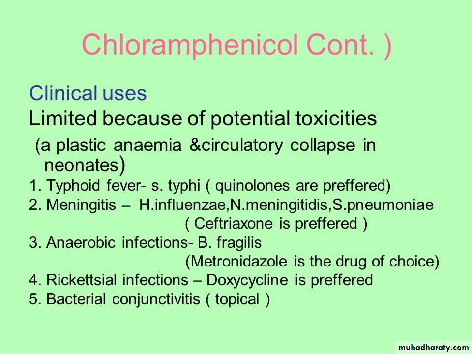 • Because of potential toxicity, bacterial resistance, and the availability of many other effective alternatives, chloramphenicol is rarely used.
