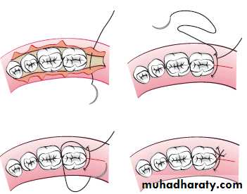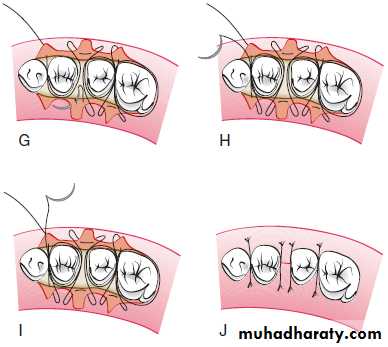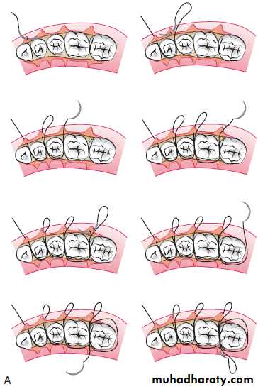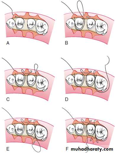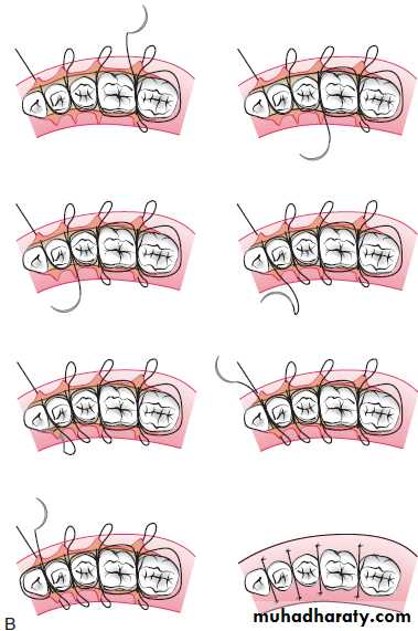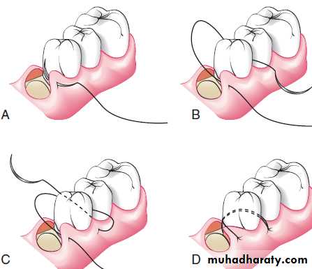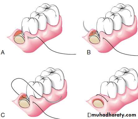 2.Interrupted figure-eight suture is used to approximate the buccal and lingual flaps. The needle penetrates the (A) outer surface of the first flap and (B) the outer surface of the opposite flap. (C) The suture is brought back to the first flap, and (D) the knot is tied.