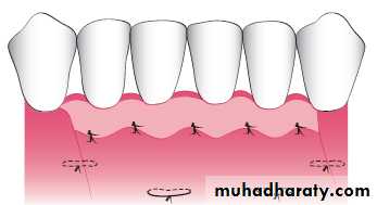 Periosteal sutures for an apically displaced flap. Holding sutures, which are shown at the bottom, are placed first. This is followed by the closing sutures, which are shown at the coronal edge of the flap.