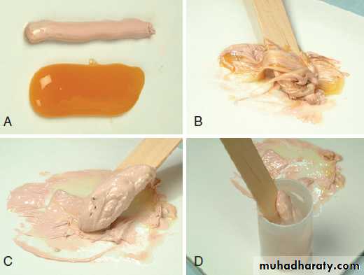Preparation and Application of Dressing(A) Equal lengths of the two pastes are placed on a paper pad. (B) The pastes are mixed with a wooden tongue depressor for 2 or 3 minutes until (C) the paste loses its tackiness. A capsule of tetracycline powder can be added at this time.(D) The mixed paste is placed in a paper cup of water at room temperature. With lubricated fingers, it is then rolled into cylinders and placed on the surgical wound.