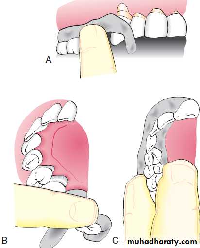 (A) A strip of pack is hooked around the last molar and pressed into place anteriorly. (B) The lingual pack is joined to the facial strip at the distal surface of the last molar and fitted into place anteriorly. (C) Gentle pressure on the facial and lingual surfaces joins the pack interproximally.