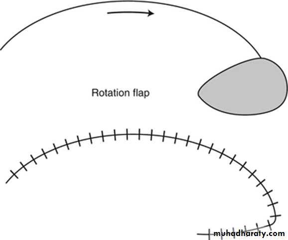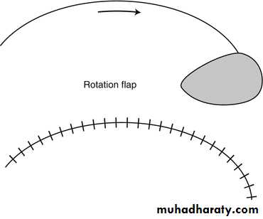 Rotation flaps pivot mobilized tissue around a point toward the primary defect.Transposition flaps are mobilized tissues that traverse adjacent tissue by rotation and/or advancement in an effort to close the primary defect.