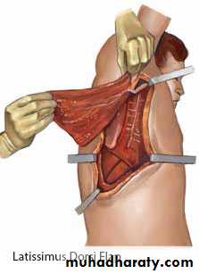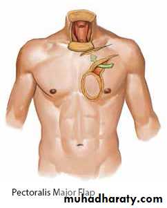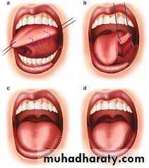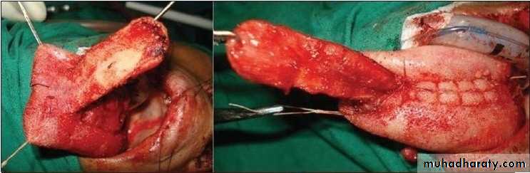 Tongue Flap: Tongue flaps have been used in the reconstruction of local defects of the floor of the mouth as well as in palatal , The flap is easy to raise and can reach 4 to 5 cm depending on the donor site used; dorsal flaps are used for palatal defects and lateral or ventral flaps are suitable for the mandible or the floor of the mouth. Tongue flap can be anteriorly based or posteriorly based. The primary drawback stems from the donor site of the tongue specifically. The tongue is sensitive and all procedures cause scarring, resulting in potential morbidities for the patient that involves speech and feeding. Leaving the tip of the tongue unharmed is of primary importance.