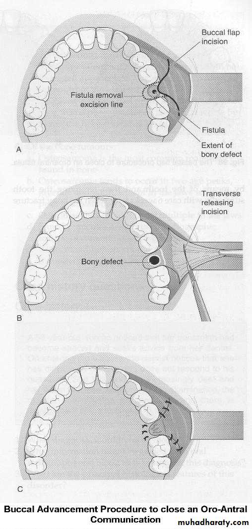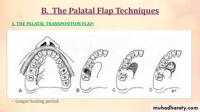 Palatal Flap: represents the most commonly used local reconstruction in oral and maxillofacial surgery for the closure of oro-antral fistulas following dental extractions. Palatal reconstructive flaps can be unilateral or bilateral, which are pedicle flaps based on the palatine artery and vein.The entire palatal mucosa can be raised and rotated as a flap or a finger flap alone can be used. The donor area is left for secondary granulation and is mucosa leaved in three to five weeks yielding a smooth surface. The area should generally be protected during healing and can be painful to the patient. In total, up to 16 cm2 can be harvested.