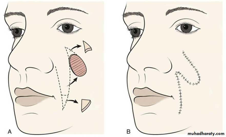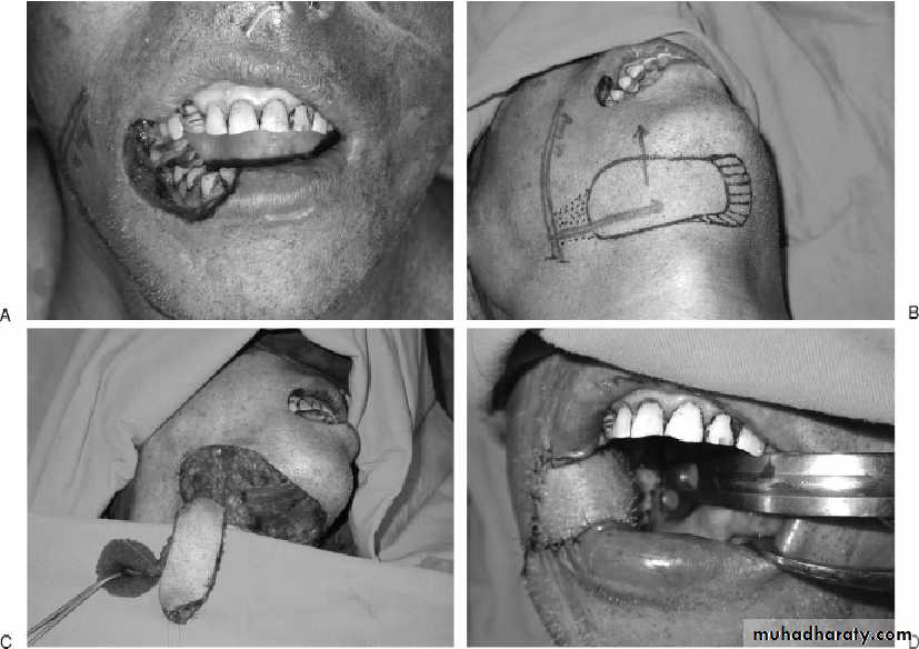 An intraoral cheek flap. (FAM flap using the facial vessels and can be raised either as a superiorly or inferiorly based flap. in raising the flap, mucosa and submucosa, buccinator muscle and a slice of the orbicularis oris are incorporated into the flap since the vessels are lateral to these structures. The flap can be used to reconstruct the palate, nasal septum, floor of the mouth, lips, as well as the tongue and alveolus. The flap can be up to 3-cm-wide and the full buccal height can be harvested.The Stensen duct of the parotid gland must be avoided