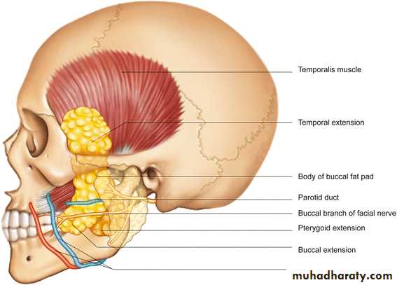Ideally suited for small retromolar and posterior maxillary defects, this axial pattern flap enjoys a strong blood supply with contributions from the buccal and deep temporal branches of the maxillary artery, the transverse facial branch of the superficial temporal artery, and buccinators branches from the facial artery. Within the fat pad, a network of small arterioles and venules are present and care must be taken to avoid disruption of these vessels through over manipulation.The buccal branches of the facial nerve and the parotid duct are lateral to the fat pad and are usually not encountered during flap development.