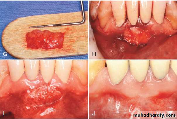 (G) Connective tissue for the graft. (H) Free connective tissue is placed at the donor site. (I) Postoperative healing at 10 days. (J) Final healing at 3 months. Notice the wide, keratinized, attached gingiva.