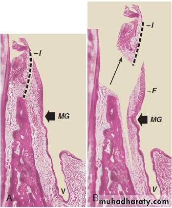 Apically displaced partial-thickness flap. (A) Internal bevel incision (I) separates the inner wall of the periodontal pocket. (B) Partial-thickness flap (F) is separated, leaving periosteum and a layer of connective tissue on the bone. The inner wall of the periodontal pocket (I) is removed, and the tooth is scaled and planed. (C) Partial-thickness flap (F) is displaced apically, with the edge of the flap at the crest of the bone. The vestibular fornix is also moved apically. (D) Partial-thickness flap (F) is displaced apically, with the edge of the flap several millimeters below the crest of the bone. MG, Mucogingival junction; V, vestibular fornix.