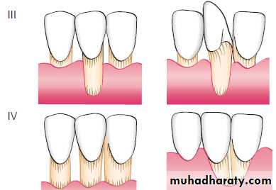 The prognoses for classes I and II are good to excellent; whereas for class III, only partial coverage can be expected. Class IV has a very poor prognosis with current techniques.Miller’s classification of denuded roots.