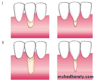 Class II. Marginal tissue recession extends to or apical to the mucogingival junction. There is no loss of bone or soft tissue in the interdental area. This type of recession can be subclassified as wide and narrow.