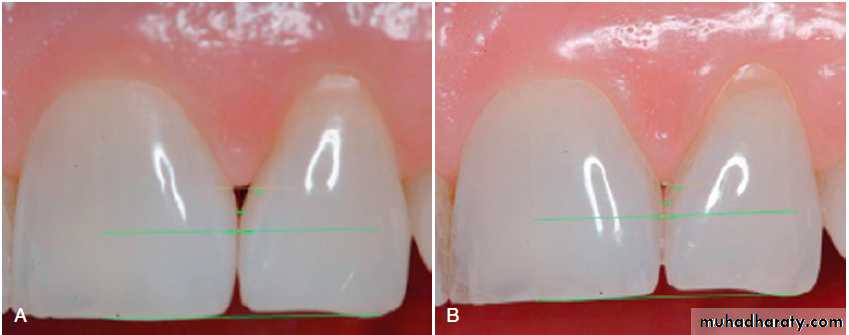 Cell Therapy (Autologous fibroblast)(A) Preoperative view of the open interproximal space. (B) Four months after three injections into the papilla with the patient’s own expanded and concentrated fibroblasts, note the improved papillary form. Green horizontal lines are used for image analysis.