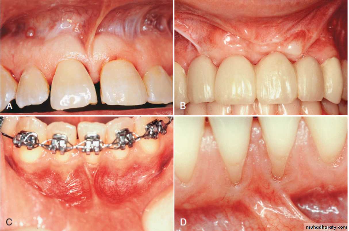 High frenum attachments. A, Frenum between maxillary central incisors. B, Frenum attached to facial surface of maxillary lateral incisors. C, Frenum attached to facial surface of mandibular incisor. D, Frenum attached to facial surface of an incisor.