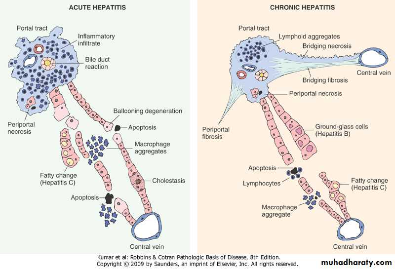 The morphological changes in acute and chronic viral hepatitis are shared among the hepatotropic viruses and can be mimicked by drug reactions or autoimmune hepatitis.Acute viral hepatitis.