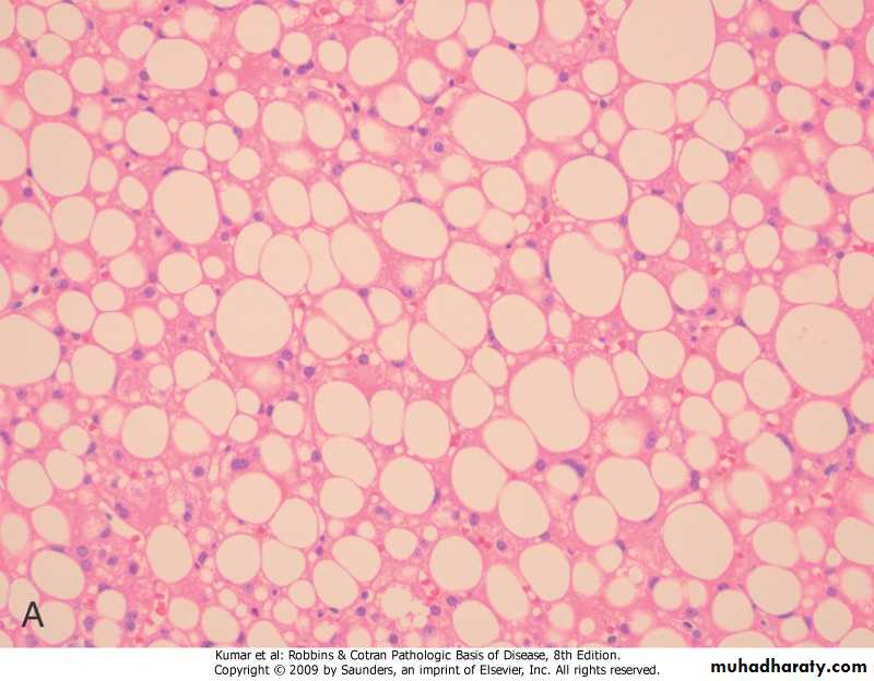 ALCOHOLIC LIVER DISEASE.pathogenesis -short-term ingestions of up to 80 mg of alcohol over one to several days cause mild reversible fatty change -daily intakes of 80 mg or more produce severe hepatic injury .only 15% develop cirrhosis -women are more prone to injury than men (? genetic susceptibility)