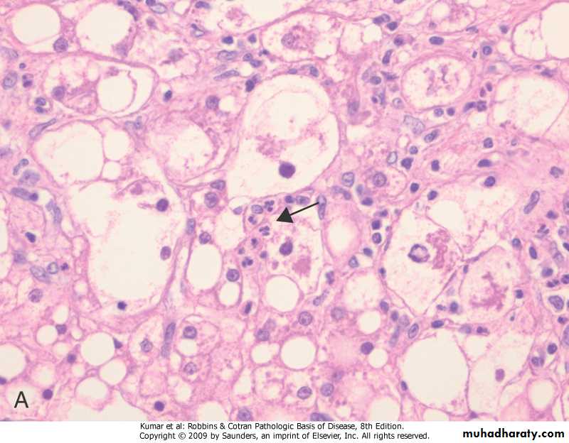 Alcoholic hepatitis, Mallory bodies, Masson stainAlcoholic hepatitis: Mallory bodies are visible as eosinophilic cytoplasmic inclusions in degenerating hepatocytes
