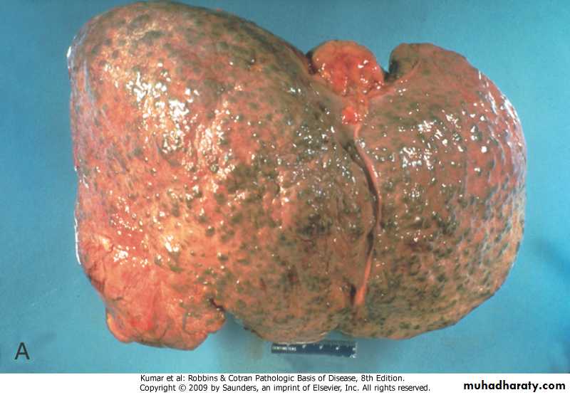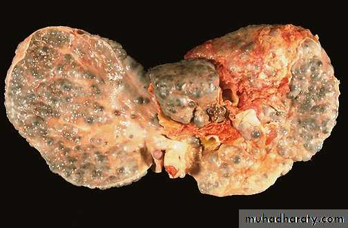 Metastatic Tumors .far more common than primary ones .the most common primaries -breast -lung -colon.typically, multiple nodules are produced