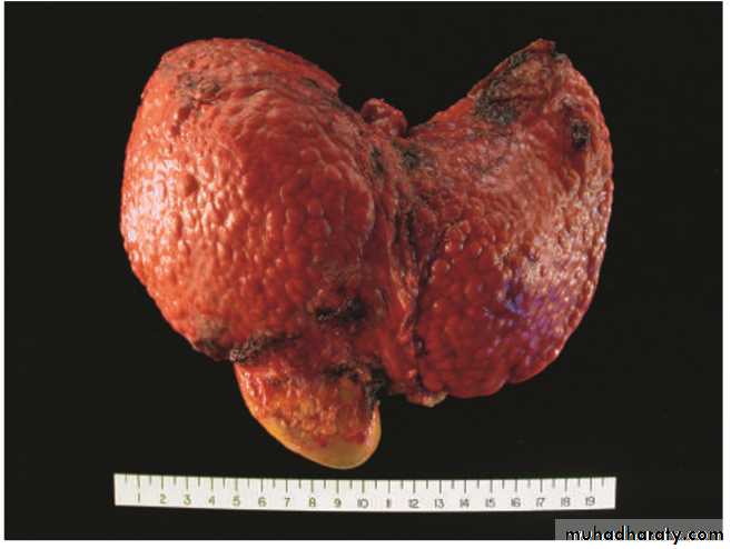 Grossly:- Micronodular cirrhosis. The regenerative nodules are quite small, averaging less than 3 mm in size.