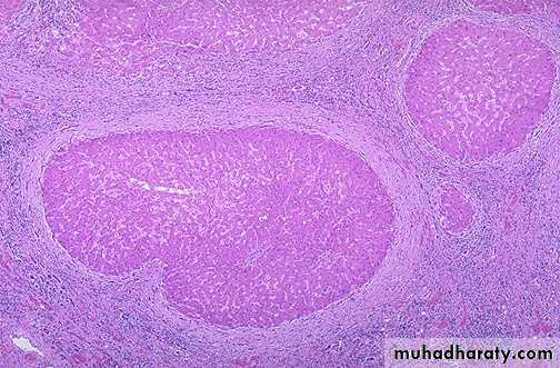 Cirrhosis is the morphologic change most often associated with chronic liver disease; it defined by 3 characteristics:-bridging fibrous septae