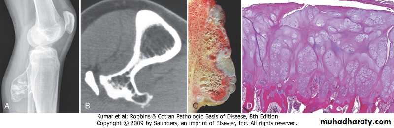 Osteochondromas (Exostoses).benign cartilage-capped outgrowths with a bony stalk .can be solitary (adolescents, young people) or multiple (children), . with M:F ratio of 3:1 .present as slowly growing masses of long bones, especially abound the knee, sometimes painful.rarely (<1%) give rise to sarcoma
