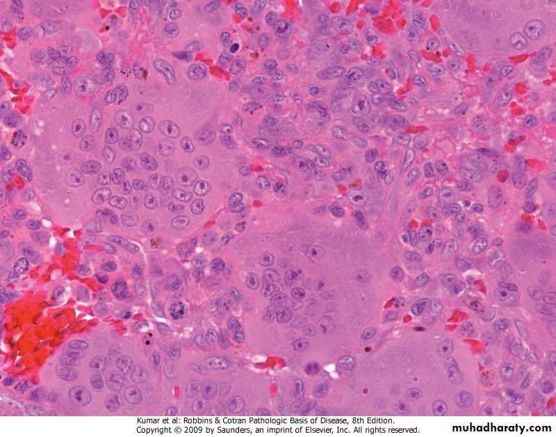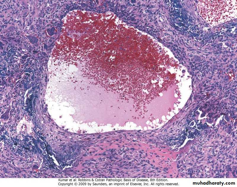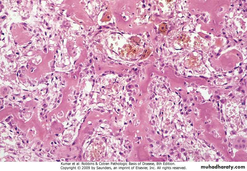 • The histologic findings of chronic osteomyelitis are more variable but typically involve marrow fibrosis, sequestrum, and an inflammatory infiltrate of lyhocytes and plasma cells.Tuberculous Osteomyelitis .organisms are usually blood-borne .the lesion is usually solitary, most commonly involved is the spine (Pott disease)