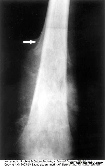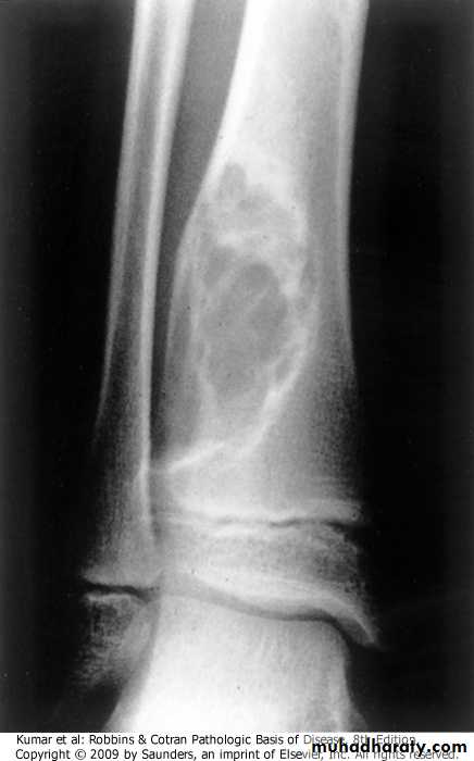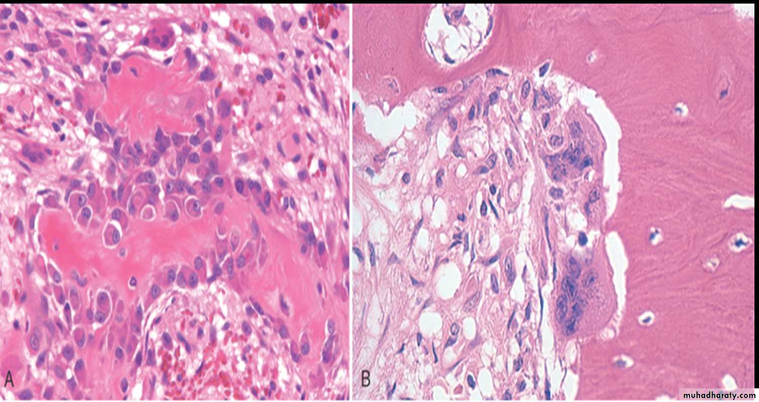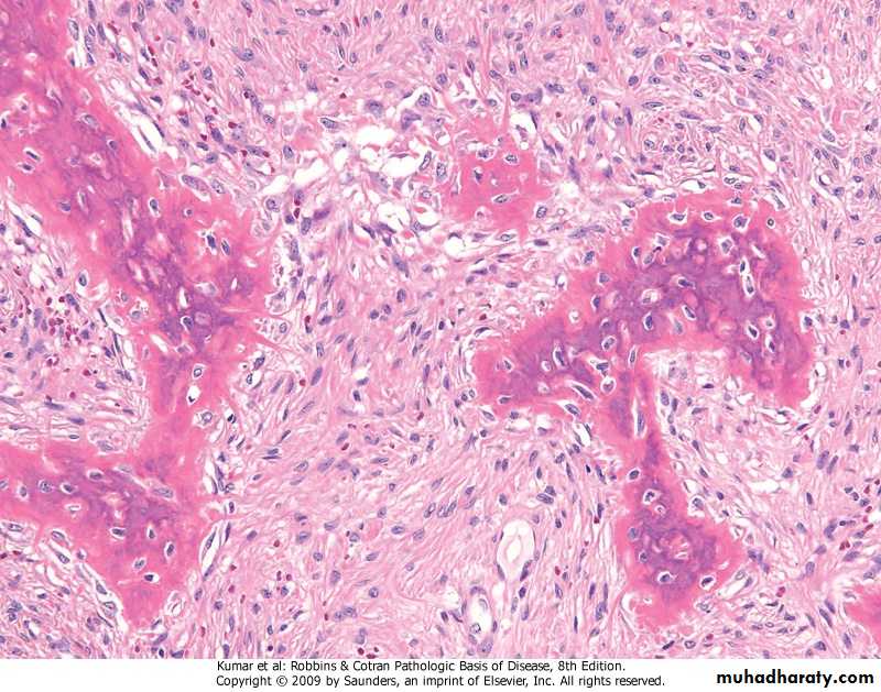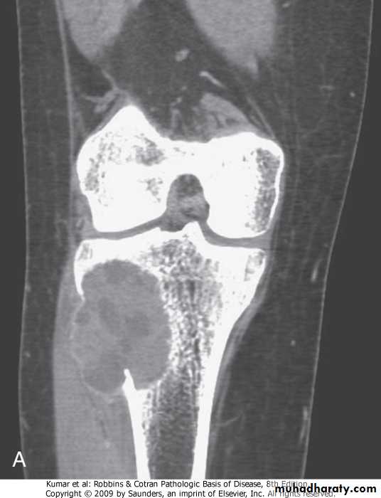 Osteosarcomas:.most common primary malignant tumors of bone, with bimodal age incidence; 1st 2 decades of life, and in elderly secondary to, (Paget disease, bone infarcts, prior radiation).more common in males, arising from the metaphysis of long bones, especially around the knee, presenting as painful mass, or as bone fracture .Codman triangle is a characteristic but not a diagnostic x-ray finding