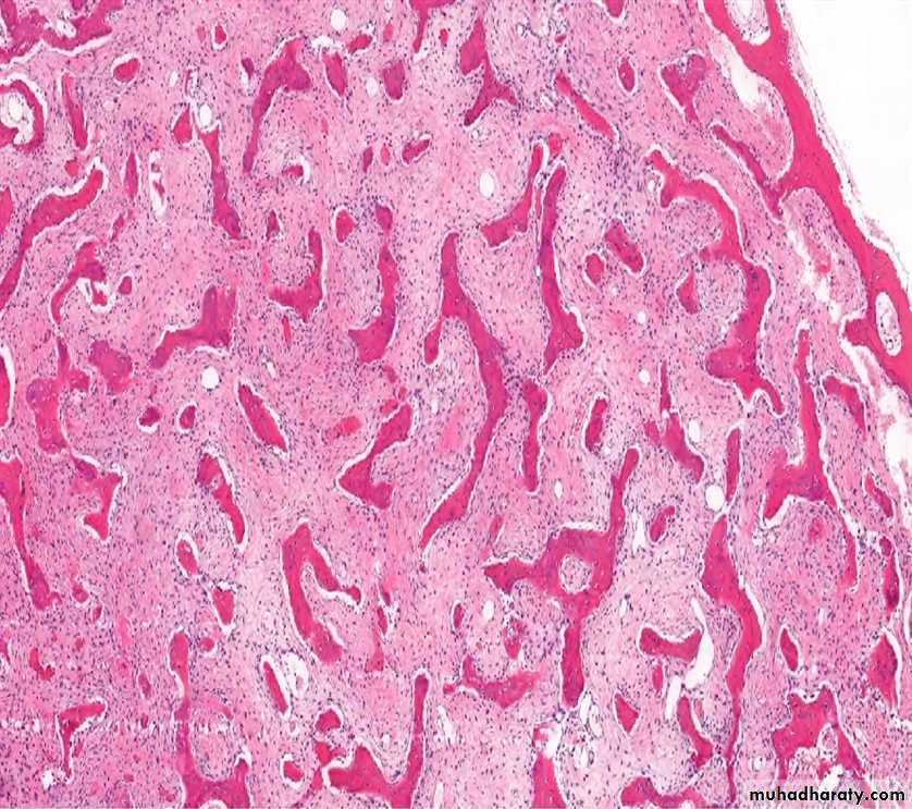 Morphology: -mosaic pattern of lamellar bone .clinical course: -usually discovered incidentally by radiology -can be monostotic or polystotic -most frequent features .pain, localized to the affected bone .benign tumors and tumor-like lesions .sarcomas