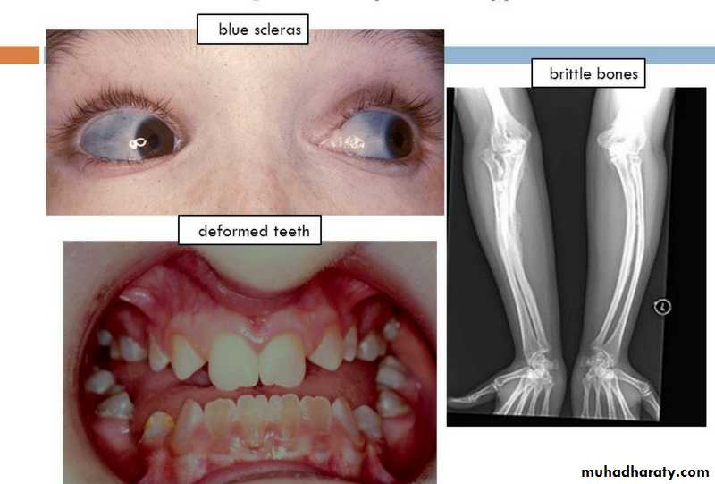 Bone Modeling And Remodeling .osteoblasts and osteoclasts act in coordination and are considered the functional unit of bone known as the basis multicellular unit (BMU) .modeling (growing and enlargement of skeleton) .remodeling (breakdown and renewal of bone)Diseases associated with deranged metabolism of collagen: -Osteogenesis imperfecta (OI), deficiency of type 1 collagen. - The fundamental abnormality in OI is too little bone, resulting in extreme skeletal fragility.- AD type of inheritance.- Blue sclera, hearing loss ; and dental imperfections (small, malformed, and blue-yellow teeth) secondary to a deficiency in dentin.