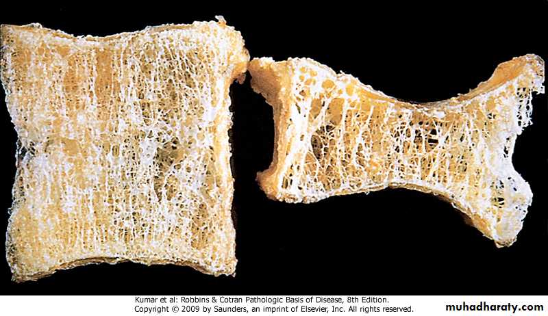 Morphology: -thinned trabeculae>microfractures .Diagnosis: -estimation of bone amount by biopsy -radiographic imaging techniques.Prevention and treatment: -exercise -calcium and vitamin D supplement -pharmacologic agents
