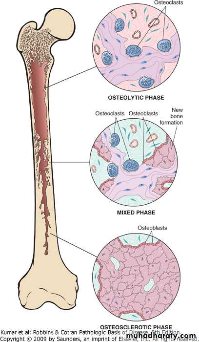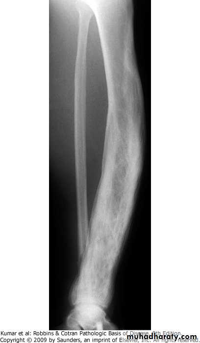 RICKETS AND OSTEOMALACIA.Rickets in children, and Osteomalacia in adults, are characterized by a defect in mineralization of matrix>osteopenia .causes -inadequate synthesis or dietary deficiency of vitamin D -decreased absorption of vitamin D -derangement in vitamin D metabolism -phosphate depletionPAGET DISEASE (OSTEITIS DEFORMANS).gain of disordered bone mass, divided into: -initial osteolytic stage -mixed osteoclastic-osteoblastic stage -osteosclerotic stage.pathogenesis -infection by paramyxovirus -abnormal osteoclasts -hereditary component