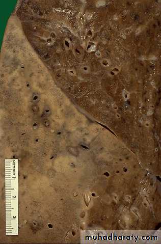 * the reaction consist of focal suppurative exudates that fills the bronchi, bronchioles, and adjacent alveolar spaces.* The intervening areas are normal .