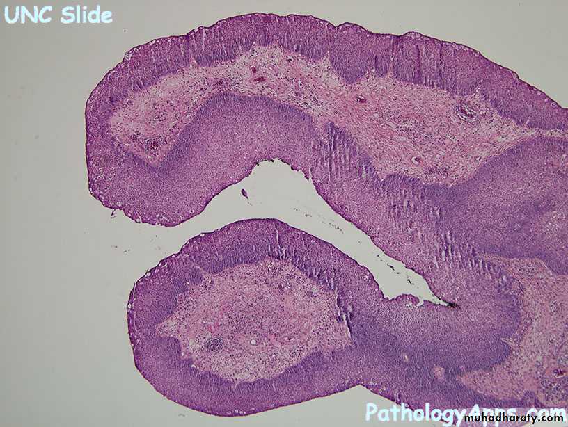pathological features: papillomatous proliferation of squamous epithelium.
