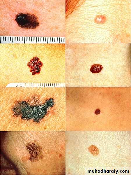 A: Asymmetry, B: Irregular Border, C: Variegated Color, D: Diameter more than 6 mm, E: Evolving which mean any change in color, size or shapeThere are three types: